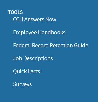 In addition to finding policies by topic as outlined above, you can also view all handbook resources in one place. Click Resources; under Tools, look for Employee Handbooks; click to open folders that contain sample policies, guidance, and employee handbooks for various states.