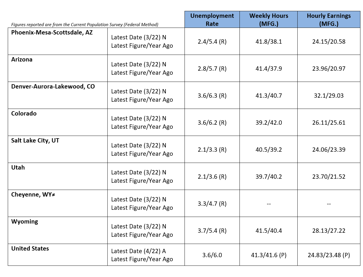 ≠ Weekly Manufacturing Hours and Hourly Manufacturing Earnings data not available for Cheyenne, Wyoming.