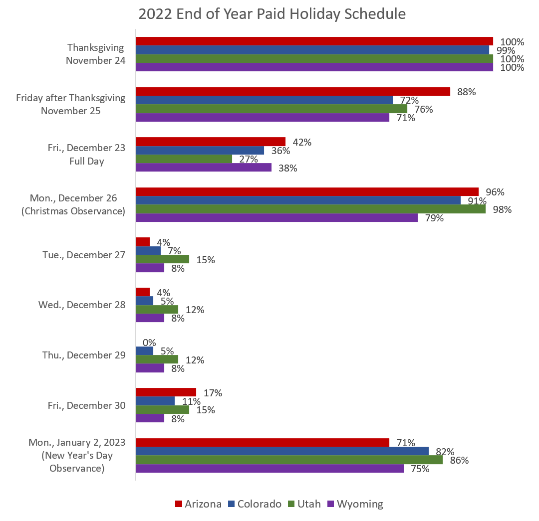 The chart below shows the percentage of organizations giving certain 2022 paid holidays. The data represent responses from 474 employers across Arizona, Colorado, Utah, and Wyoming. Watch for the 2023 paid holiday schedule in a January 2023 Employers Council article.