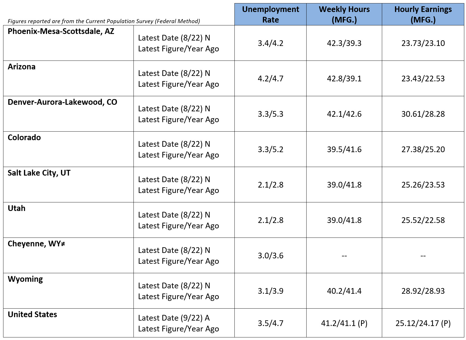 ≠ Weekly Manufacturing Hours and Hourly Manufacturing Earnings data not available for Cheyenne, Wyoming.